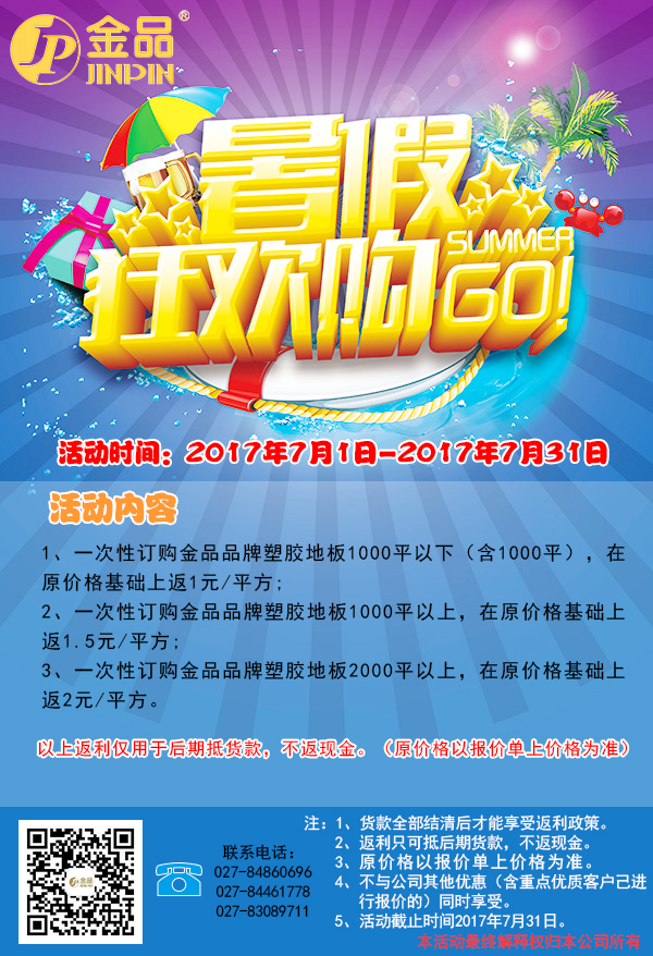 2、一次性訂購金品品牌塑膠地板1000平以上,在原價格基礎(chǔ)上返1.5元/平方;